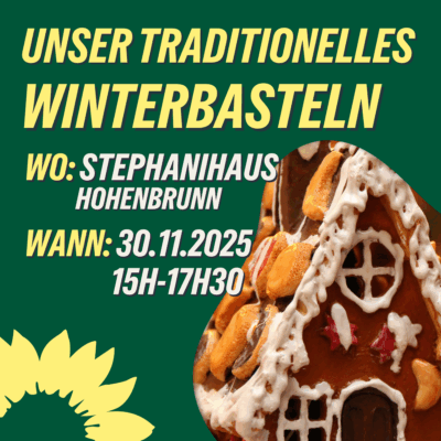 Herzliche Einladung an alle Kinder und Begleitpersonen: Wir verzieren Lebkuchenhäuser und basteln kleine Geschenke. Für Verpflegung ist gesorgt. Wir bitten um Anmeldung unter: mail [at] gruene-hohenbrunn [dot] de